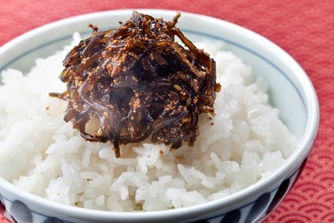 日高昆布の細切りとシシャモ卵を炊き合わせた、昔懐かしい甘辛い味わいの田舎惣菜です。魚卵の旨みと食感がアクセント。日高昆布の風味も生きています。