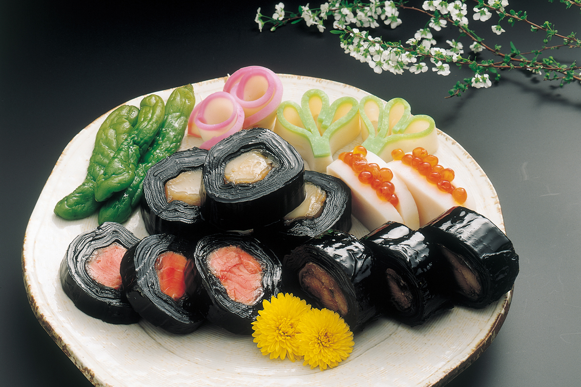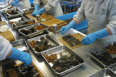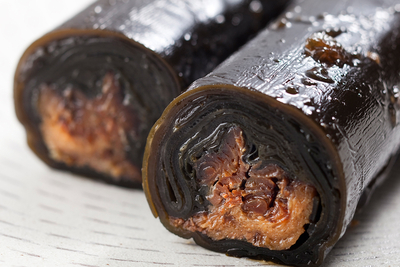 日高昆布といえば、昆布巻き。日高昆布の産地では、夏には昆布を、秋には鮭を干して昆布巻きをこしらえ、古くは冬ごもりのための保存食に、近年は日本の伝統食として親しまれています。「よろこぶ」は語呂合わせ。「養老昆布(よろこぶ)」は不老長寿、「子生(こぶ)」は子孫繁栄への願いを込めた当て字。昆布巻きはお正月をはじめ、ハレの日には欠かせない郷土料理です。昭和46年に発売された「えりも巻」は、日高昆布の産地を代表する伝統ある昆布巻きとして、師走を告げる全国ニュースでご紹介いただく機会も多い商品です。(ギフト用 3本入・5本入もご用意しています)