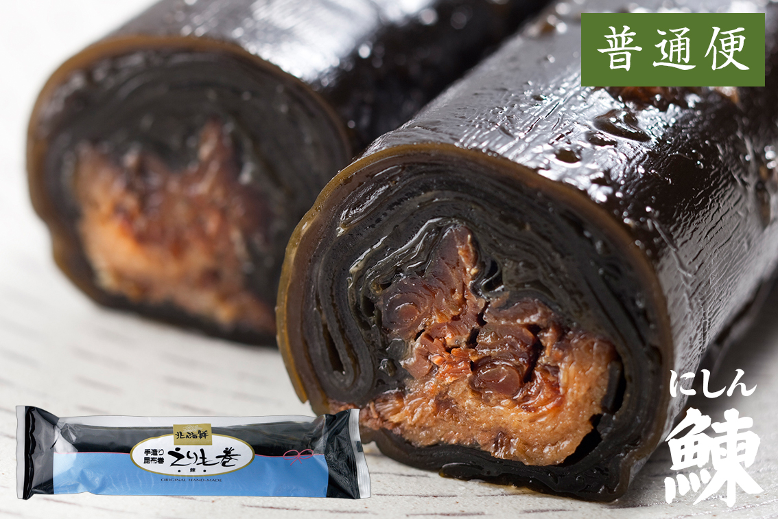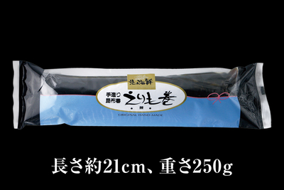 型くずれしないように寒天を使って巻き上げる「えりも巻」は、長さ約21センチ、重さ250グラムの堂々たる風格。柔らかく炊いた日高昆布を幾重にも重ねて『鰊(にしん)』をたっぷりのせて、1本1本、丁寧に仕上げます。召し上がる時は、お好みの長さに切り分けて(1本まんまだと恵方巻!)、お召し上がりください。