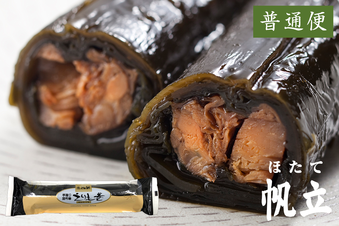 型くずれしないように寒天を使って巻き上げる「えりも巻」は、長さ約21センチ、重さ250グラムの堂々たる風格。柔らかく炊いた日高昆布を幾重にも重ねて『北海道産帆立貝(ほたて)』をたっぷりのせて、1本1本、丁寧に仕上げます。召し上がる時は、お好みの長さに切り分けて(1本まんまだと恵方巻!)、お召し上がりください。