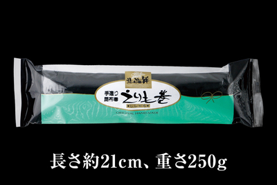 型くずれしないように寒天を使って巻き上げる昆布巻きは、長さ約21センチ、重さ250グラムの堂々たる風格。柔らかく炊いた日高昆布を幾重にも巻きつけ、1本1本、丁寧に仕上げます。昭和46年に発売された「えりも巻」は、日高昆布の産地を代表する伝統ある昆布巻きとして、師走を告げる全国ニュースでご紹介いただく機会も多い商品です。