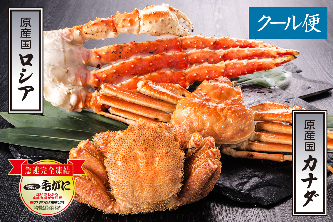 【数量限定】特別企画の豪華セットです。毛蟹は当社の名物「活蒸し毛蟹」(北海道産)。たらば蟹 脚肉(ロシア産上物)・本ずわい蟹姿(カナダ産上物)は、当社が信頼する北海道の蟹専門の水産会社がロシア・カナダの名産地で目利きして買い付けた、獲れたてを冷風で即急速冷凍した『エアブラスト凍結もの』。いずれも鮮度と旨みを優先した品質です。安心して贈り物にもお使いください。