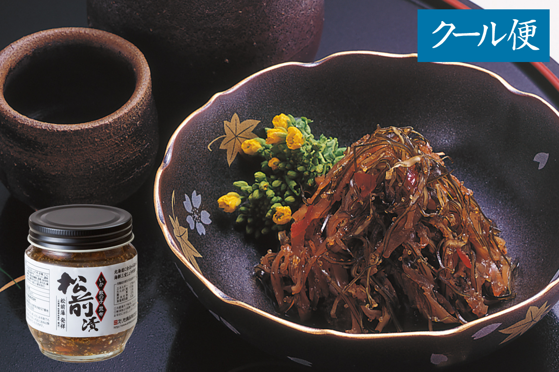 松前漬は松前藩(現在の北海道松前町周辺)の伝統的な郷土料理。パリパリのカズノコ(バラ子)と細切りしたスルメを、ねっとりと糸を引く細切り昆布と絡めて熟成させた昔ながらの醤油味の珍味です。昆布のぬめり、スルメと数の子の歯ごたえをお楽しみください。昔ながらのスタンダートタイプです。(いか塩辛との箱入セットもご用意しております)