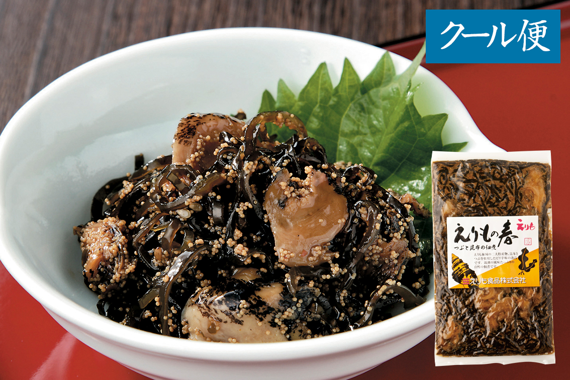 獲れたての大粒の灯台つぶ貝と日高昆布の細切りと魚卵を、コトコト炊き合わせた具沢山の佃煮です。北海道えりも町内にある本社売店で販売する町民還元品として開発した商品です。アツアツご飯のお供にどうぞ。