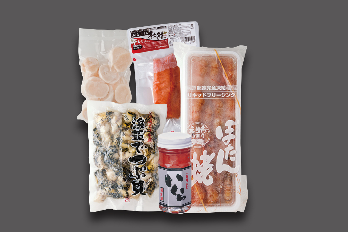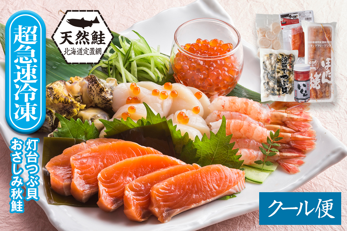 - 商品内容:おさしみ秋鮭(150g×1袋)、ぼたんえび(250g×1パック)、浜ゆで灯台つぶ貝(250g×1袋)、ほたて玉冷(200g×1袋・7玉から8玉)、いくら醤油漬(80g瓶×1・たれ付)