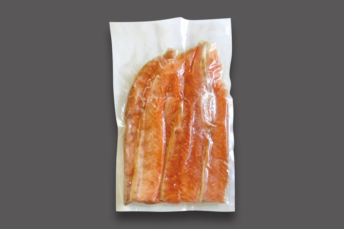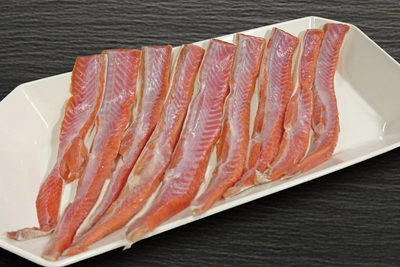 当社工場の加工端材のひとつ、北海道産の秋鮭(新巻鮭)のハラスです。冷蔵庫で解凍し、お好みの長さに切り分けて焼いてお召し上がりください。美味しい脂がジワ〜ッとしたたります。秋鮭は昔から、頭・尾・内臓に至るまですべて食べられる「捨てるところがない魚」として重宝されてきました。ぜひ、お楽しみください。