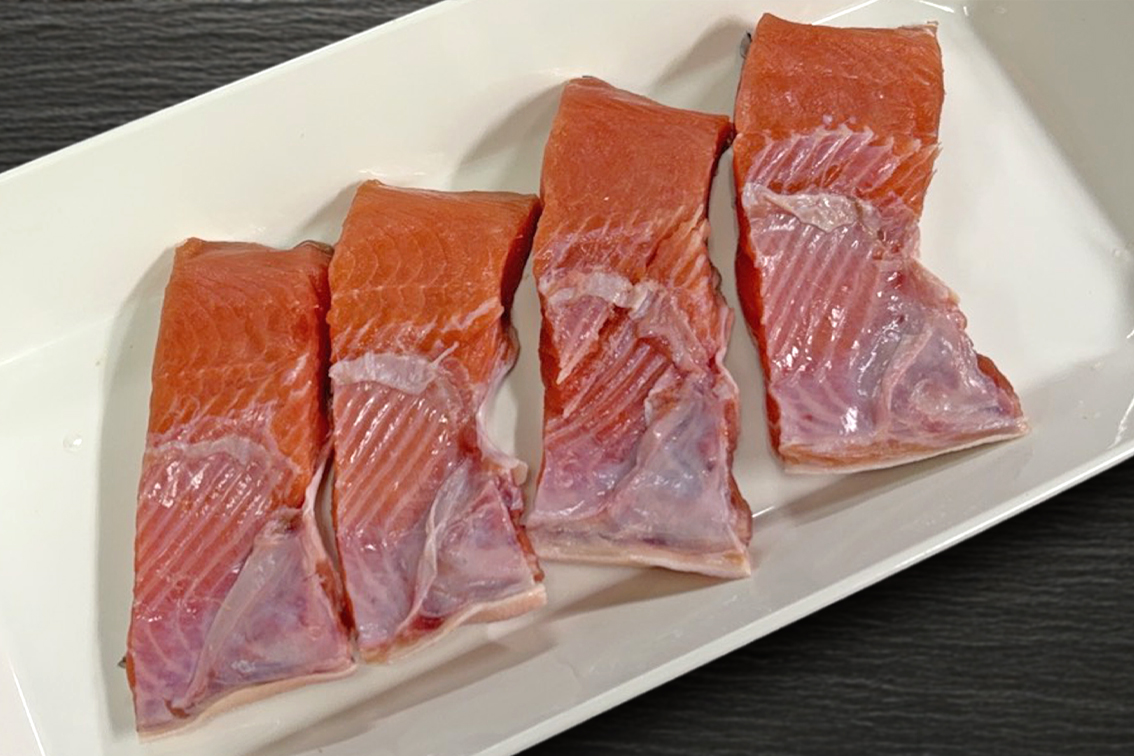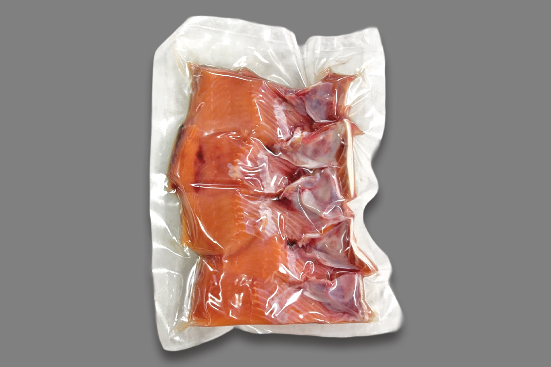 当社工場の加工端材のひとつ、北海道産の秋鮭(新巻鮭)のカマです。冷蔵庫で解凍し、コンロでこんがり焼いてお召し上がりください。さっと煮付けたり、三平汁に使っても美味。秋鮭は昔から、頭・尾・内臓に至るまですべて食べられる「捨てるところがない魚」として重宝されてきました。ぜひ、お楽しみください。