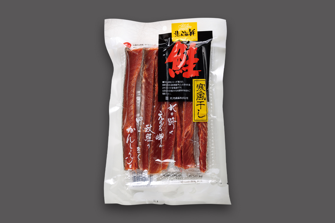北海道産の秋鮭を塩水にくぐらせて干し上げた昔ながらの鮭とばです。秋鮭本来の自然な味わいと、噛み応えのあるしっかりした歯ごたえが特徴です。