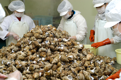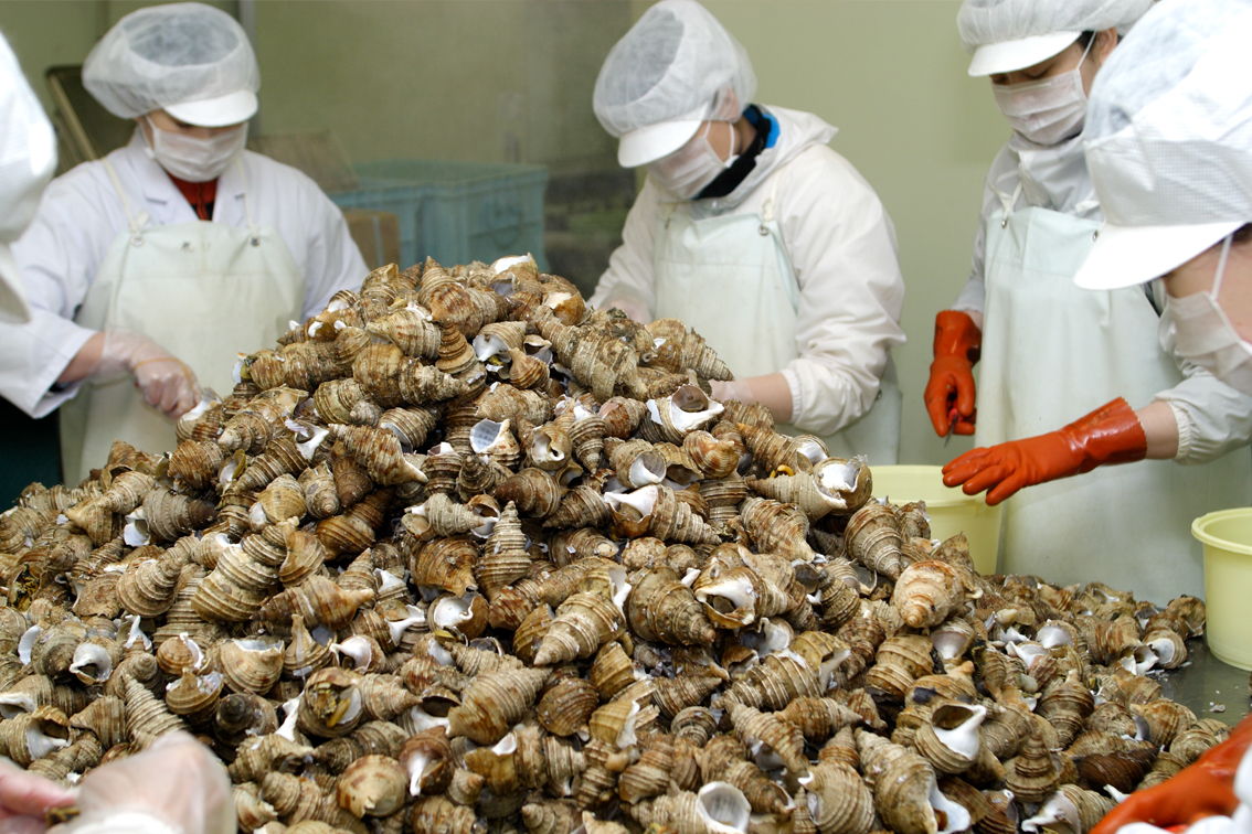 北海道日高沿岸は、灯台つぶ貝の名産地です。当社では獲れたての高鮮度を保ったまま大釜で程よく炊き上げ、1粒1粒、手早く手剥きしています。灯台つぶ貝は大粒で甘みがあり、加熱しても柔らかいのが特長です。この魅力を最大展に引き出す商品は、刺身用・惣菜・佃煮など全6種類。さあ、灯台つぶ貝の味わいづくしはいかがでしょう。週末は、灯台つぶ貝三昧の楽しい食卓・晩酌を。
