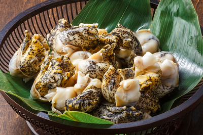 12. 獲れたての灯台つぶ貝を炊いてスライスして燻製した珍味。